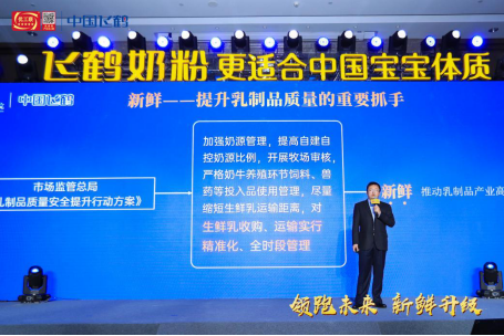奶粉新國標發布1個月之後,中國飛鶴與中國標准化研究院一起公布了企業的新鮮奶源標准和新鮮飼料標准,後續還將對其他維度的標准進行昇級,進一步對新鮮的定義進行昇級和擴展到土地、飲用水、飼草飼料等多個方面,進一步強化新鮮的概念。