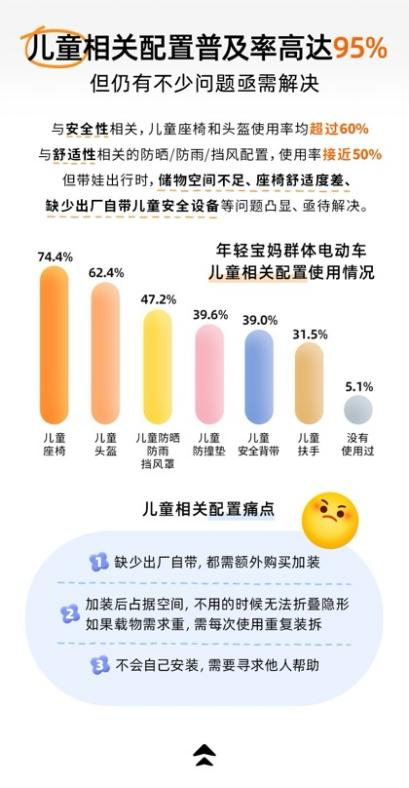 在寶寶樹發布《2025年年輕寶媽電動車出行白皮書》中也反映出一些在使用過程中的現實痛點。單人出行時,儲物空間不足、車輛自重較大、推行不便等問題較為常見;攜子出行時,則更關注兒童乘坐的安全性、座椅舒適度及應對天氣變化的靈活性。盡管兒童座椅、頭盔等配件使用率較高,用戶仍期待更便捷、更節省空間的整合解決方案。